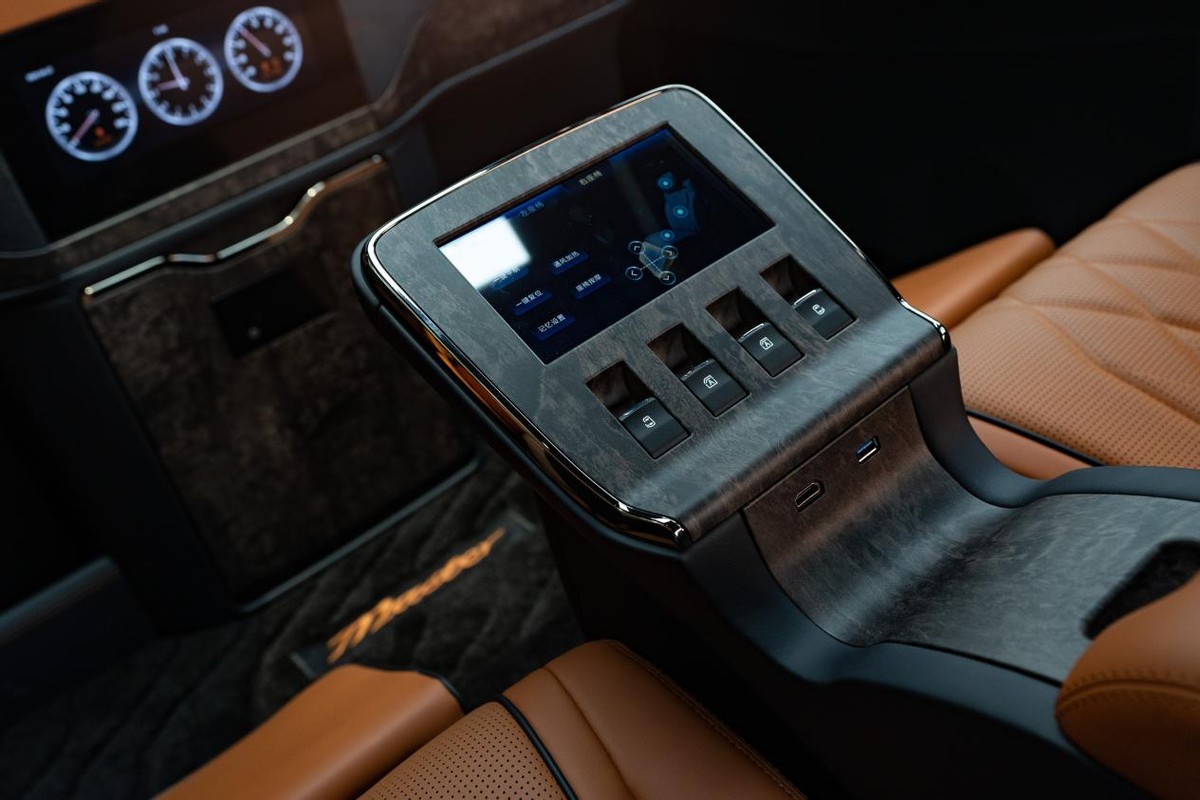 在细节处,新内饰更是在原基础上增加点缀元素,在二排两侧仿臂型弧面扶手处、方向盘、吧台等范围内运用奢华玛瑙木纹装饰件,生动还原天然真木头纹路,既环保又美观。