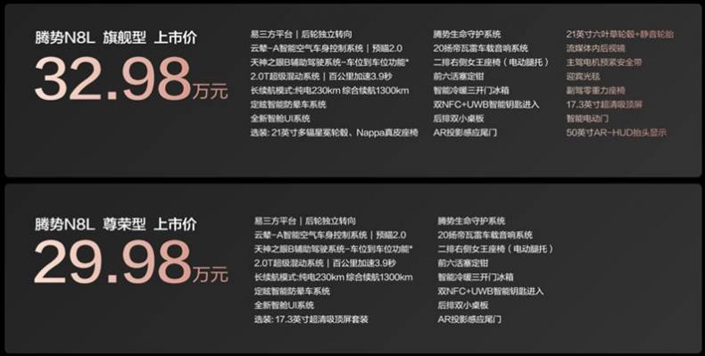 车市头条讯:10月28日,“大六座安全豪华SUV”腾势N8L正式上市,共推出2款车型,官方指导价为29.98万元~32.98万元!N8L全系标配“六大核心科技”,以超越传统豪华的品质标准,诠释家用车的豪华感、安全感与科技感,创造让全...