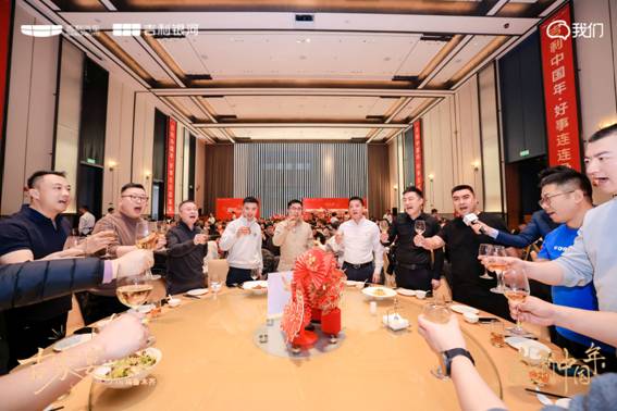 灯光聚焦,全场目光汇聚于主舞台。在热烈的掌声中,吉利品牌西北区域的各位领军人物,手持酒杯,向全场家人致以诚挚问候。